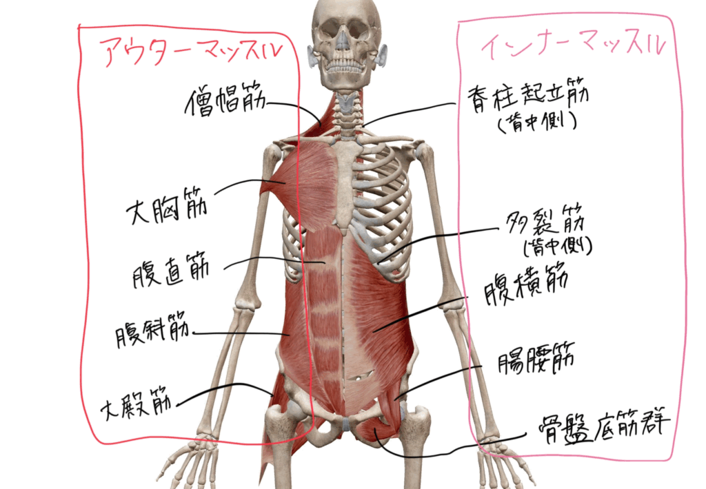 ・筋肉:腹筋、背筋、肩甲骨・股関節周りの筋肉、横隔膜、骨盤底筋群など、体のインナーマッスルと表層部.アウターマッスルの様々な筋肉。