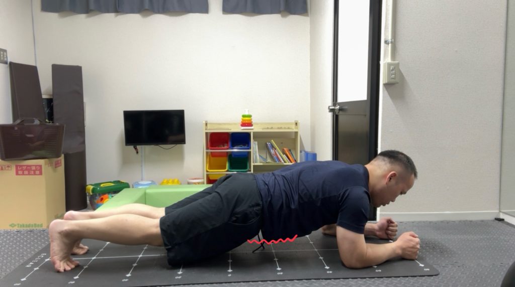 1.肘先と足先をついて体を持ち上げ全身を一直線にしたままキープ
