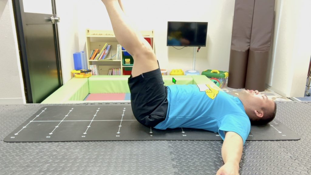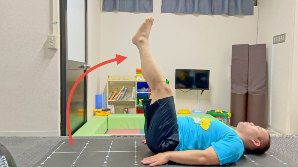 脚の付け根から両脚を持ち上げる動き(股関節屈曲)で股関節深部の
