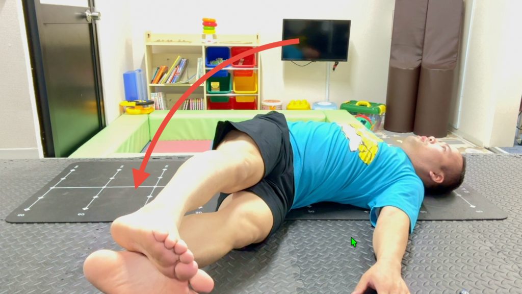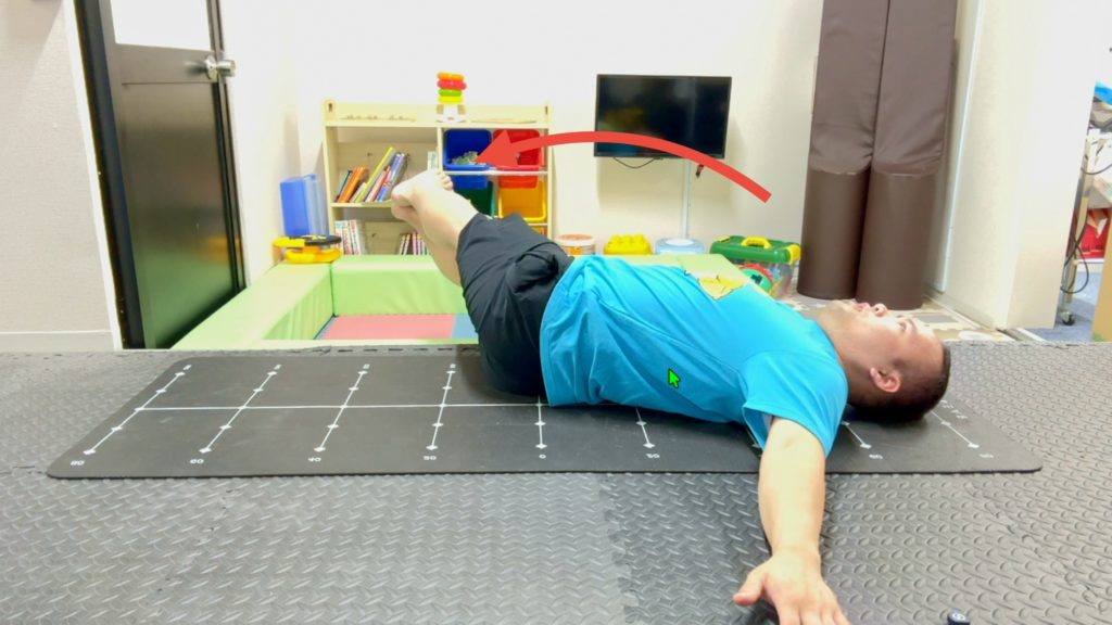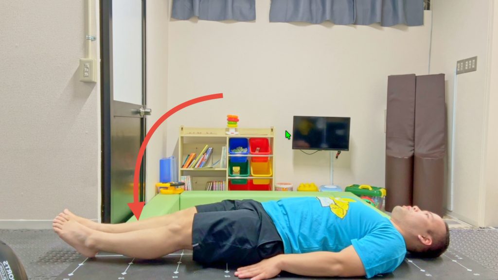 1.仰向けで寝て肩を床につけて固定する