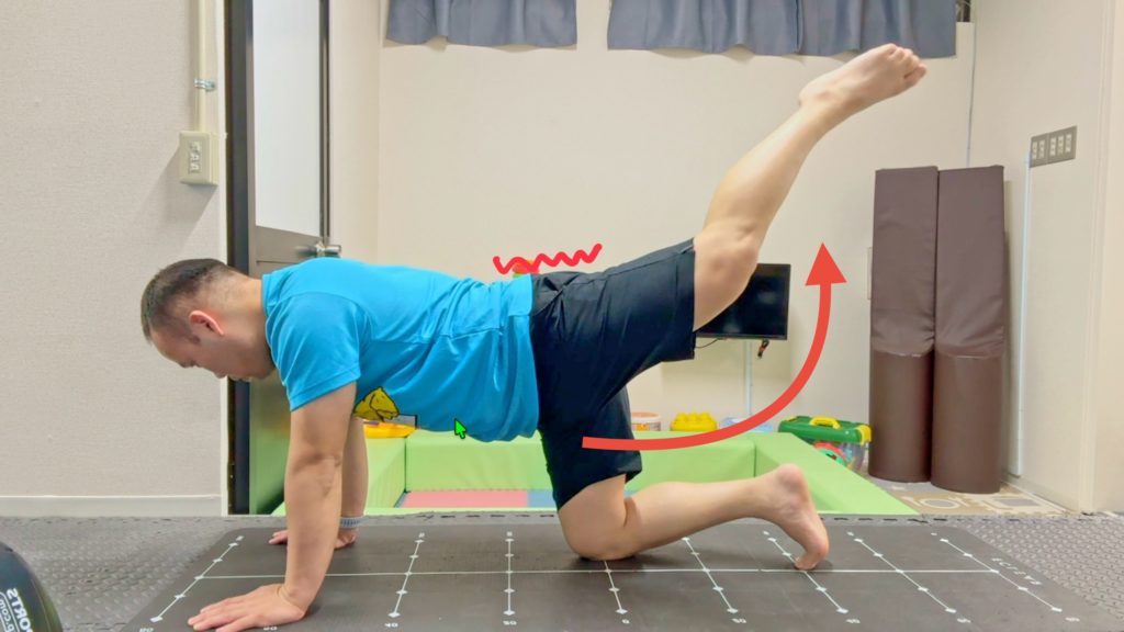 1.四つん這いになり膝を曲げ片脚だけ浮かせる