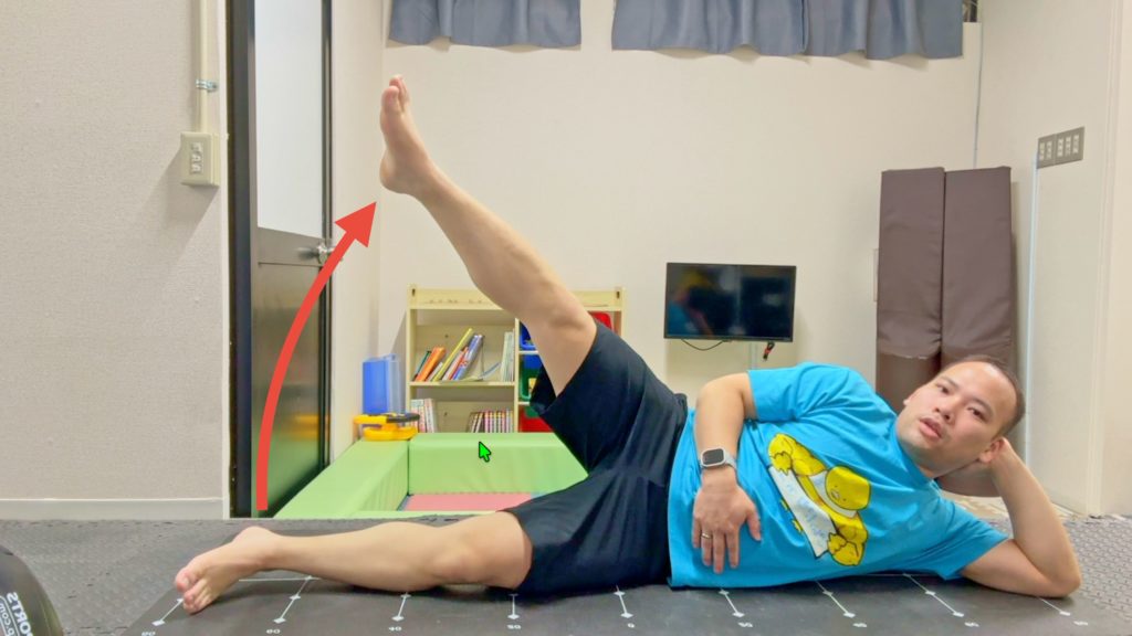 2.股関節を側方に開き上側の脚を持ち上げる