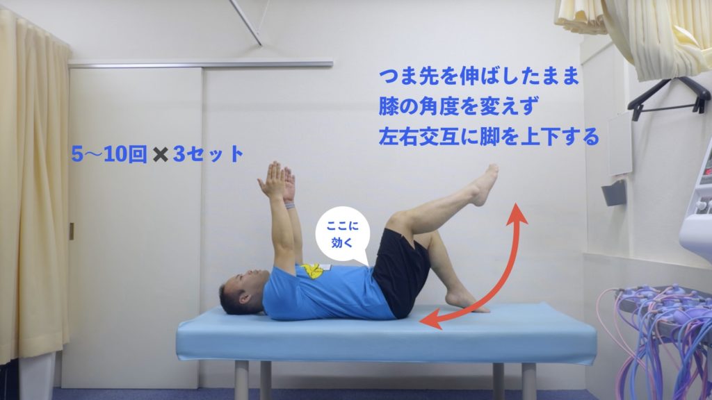 仰向けで膝を立て、手を天井へ。踵を床から少し浮かせ、腰と床の間に掌1枚分のスペースをキープしながら、左右の脚を交互に持ち上げる。腰のカーブを崩さないのがコツ。
