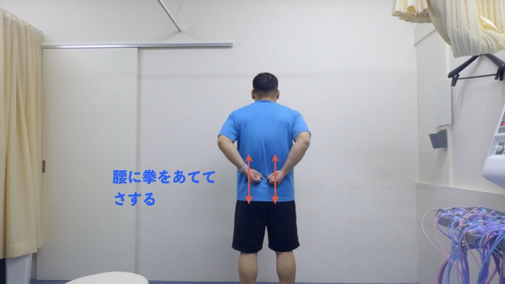 同じ姿勢で拳を握り、腰を下から上・上から下へさする。範囲は骨盤上〜みぞおち裏側まで。