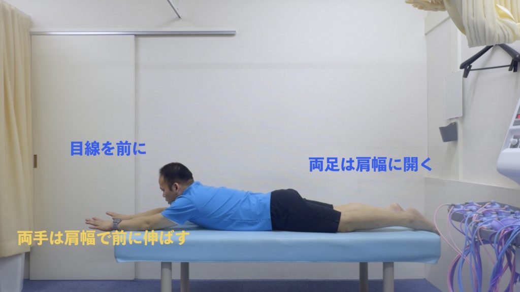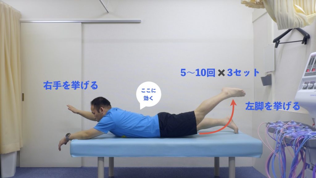 うつ伏せで両手を前方に。左手+右脚、右手+左脚を交互に床から上げる。高く上げすぎず、体幹を安定させることを重視。背筋+腹筋に効きます。