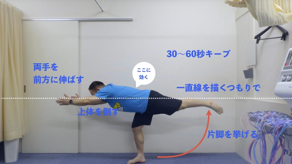 前後に足を開き、前脚膝を曲げ、後ろ脚を伸ばす。上体を前に倒し、両手を前方へ伸ばして片脚立ちに。指先からつま先まで一直線をキープ。お尻・ハム・背筋が刺激されます。