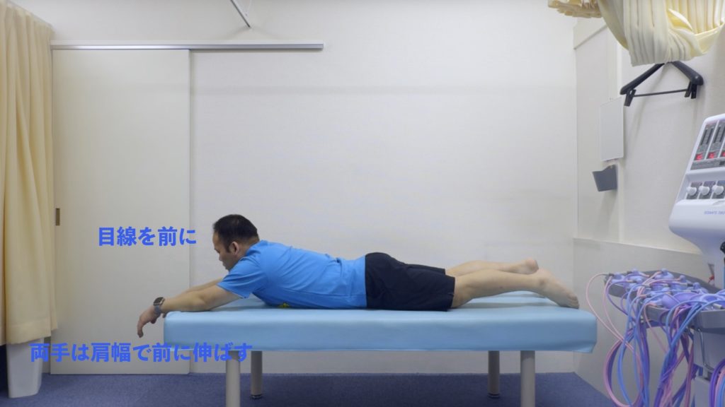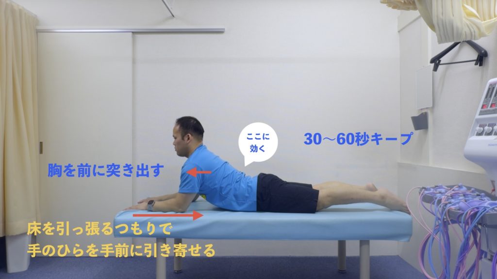 うつ伏せで手を胸の横に。床を自分の方へ引き寄せるイメージで上体を起こす。胸を前に押し出すようにして腰への負担を減らしましょう。