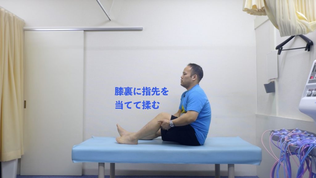 床に座り、膝裏に両手の指を当て、「M」の形にかき分けるように掴む。腰痛の特効ツボ「委中」があるので効果的。左右交互に。