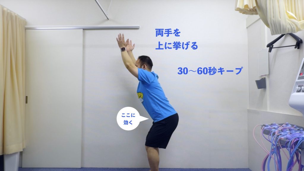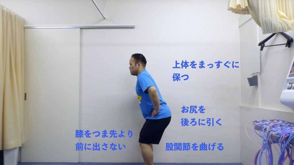 足を腰幅に開き、股関節を曲げてお尻を後ろへ。両手を上へ伸ばしてキープ。膝がつま先より前に出ないよう注意。腸腰筋・大臀筋・背筋をしっかり鍛えます。